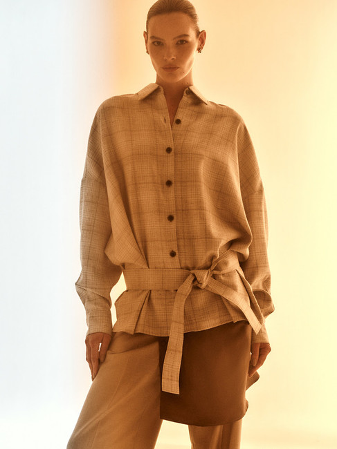 Na linha feminina, a alfaiataria é explorada e reinterpretada com leveza e elegância, onde os volumes e texturas ganham protagonismo. As camisas surgem em modelagens oversized e alongadas, com construções que equilibram fluidez e estrutura, presentes na delicadeza do crepe de seda com transparências sutis, ou na mistura de cupro com linho, que traz frescor, brilho discreto e caimento encorpado. As cores passam por tons atemporais, como bege, off-white, marrom e preto, além de variações em xadrez que adicionam profundidade visual às produções. Blazers e casacos aparecem com shapes box e releituras alongadas, incorporando lapelas marcadas, aberturas laterais e acabamentos internos em jacquard, reforçando a assinatura da marca com um toque contemporâneo e versátil.